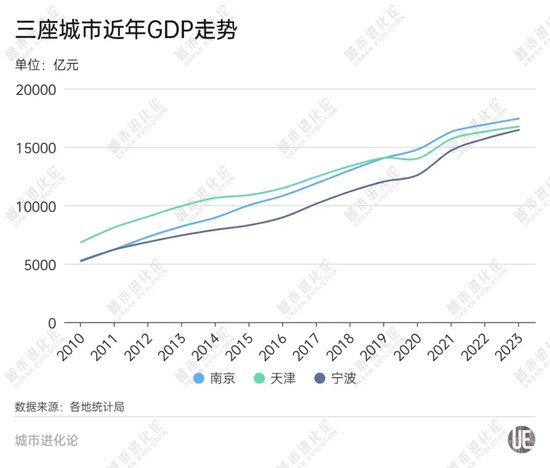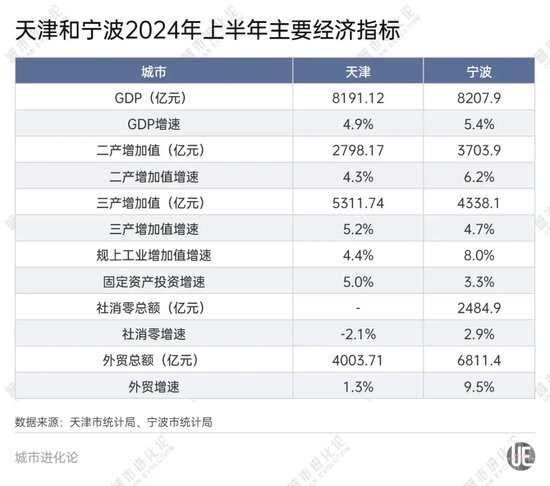 华东师范大学城市发展研究院院长曾刚分析指出,“目前一般制成品和原材料出口受国际环境影响不大,因此宁波依托舟山港往外拓展的步伐稳健”。 曾刚认为,除传统产业外,新兴产业方面,宁波以极氪为代表的新能源汽车产业发展势头很稳,加上新能源汽车延伸下来的锂电池、稀土等产业,依托一大批专精特新“小巨人”企业的发展,宁波也有所斩获。 从整个长三角城市群来看,宁波的产业链跟周边地区形成了较好的互动关系,整体发展后劲相比天津显得更足一些。 尽管如此,站在GDP进位的关键时期,宁波也并非高枕无忧。 今年上半年,宁波5.4%的经济增速,相比浙江全省(5.6%)及一季度自身增速,均低了0.2个百分点。“三驾马车”除外贸外,固定资产投资和社会消费品零售总额分别增长3.3%和2.9%,相较全省水平都有些落后。 在曾刚看来,宁波未来的发展重心,还是以制造业为主的实体经济,应该充分发挥新能源和化工产业比较优势。相比之下,宁波服务业发展空间有限,最重要的增长极是出口相关的新兴服务业,但受国际形势影响,这一块的不确定性也较大。 “天津既是‘北方第二城’,又是直辖市。从全年来看,宁波想超越它并不容易。”曾刚认为,津甬之争谁能胜出,要下定论还为时尚早。 天津转身 但显而易见的是,近年天津经济发展遭遇“逆风”,GDP排名不断退步。 作为北方开放门户,曾几何时,工业和港口是天津经济所倚赖的两张“王牌”。而2024年上半年,以宁波为参照,天津规上工业增加值增速4.4%,远低于宁波8.0%;天津港口货物吞吐量和集装箱吞吐量分别增长3.3%和4.4%,宁波舟山港两项指标则分别增长4.2%、8.4%。