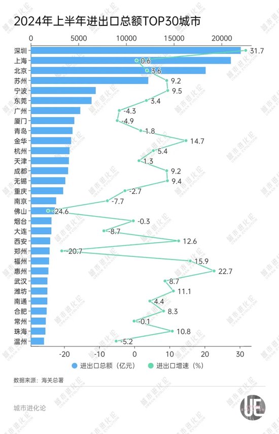 2023年上半年,宁波、天津二产增加值增速接近,分别为3.9%、3%,二产增加值差值为820.56亿元。到2024年上半年,宁波二产增加值增速提升至6.2%,较天津高出1.9个百分点,二产增加值差值进一步拉大至905.73亿元。 从“三驾马车”来看,上半年宁波外贸总额6811.4亿元,同比增长9.5%,规模再创历史新高,稳居全国城市第五。同期天津外贸总额4069.6亿元,同比增长1.3%,排在全国第12位。